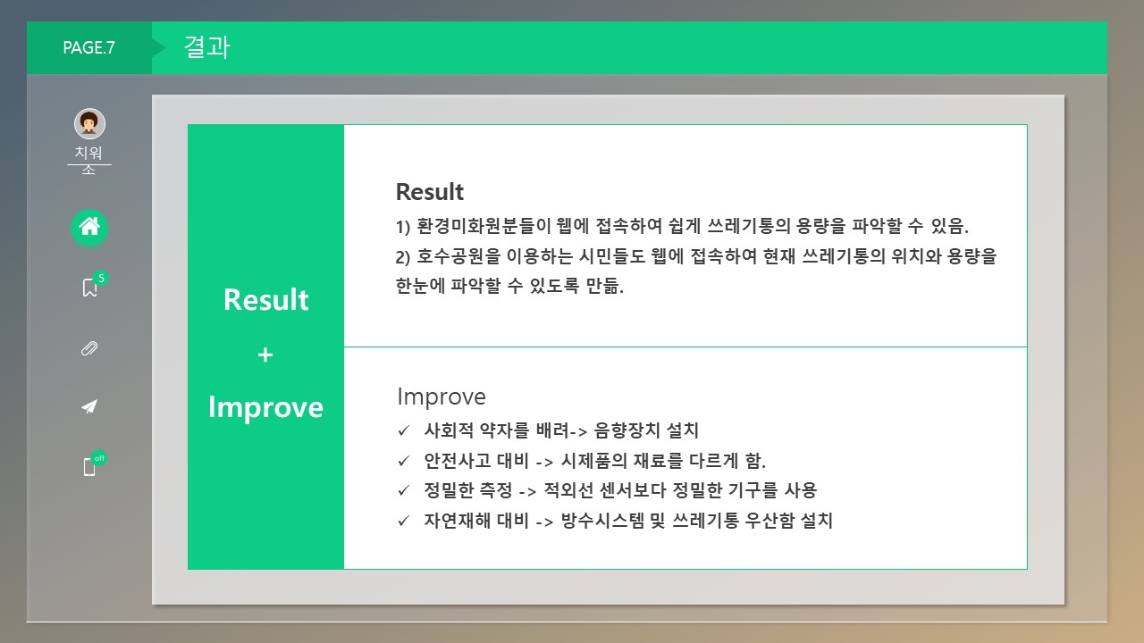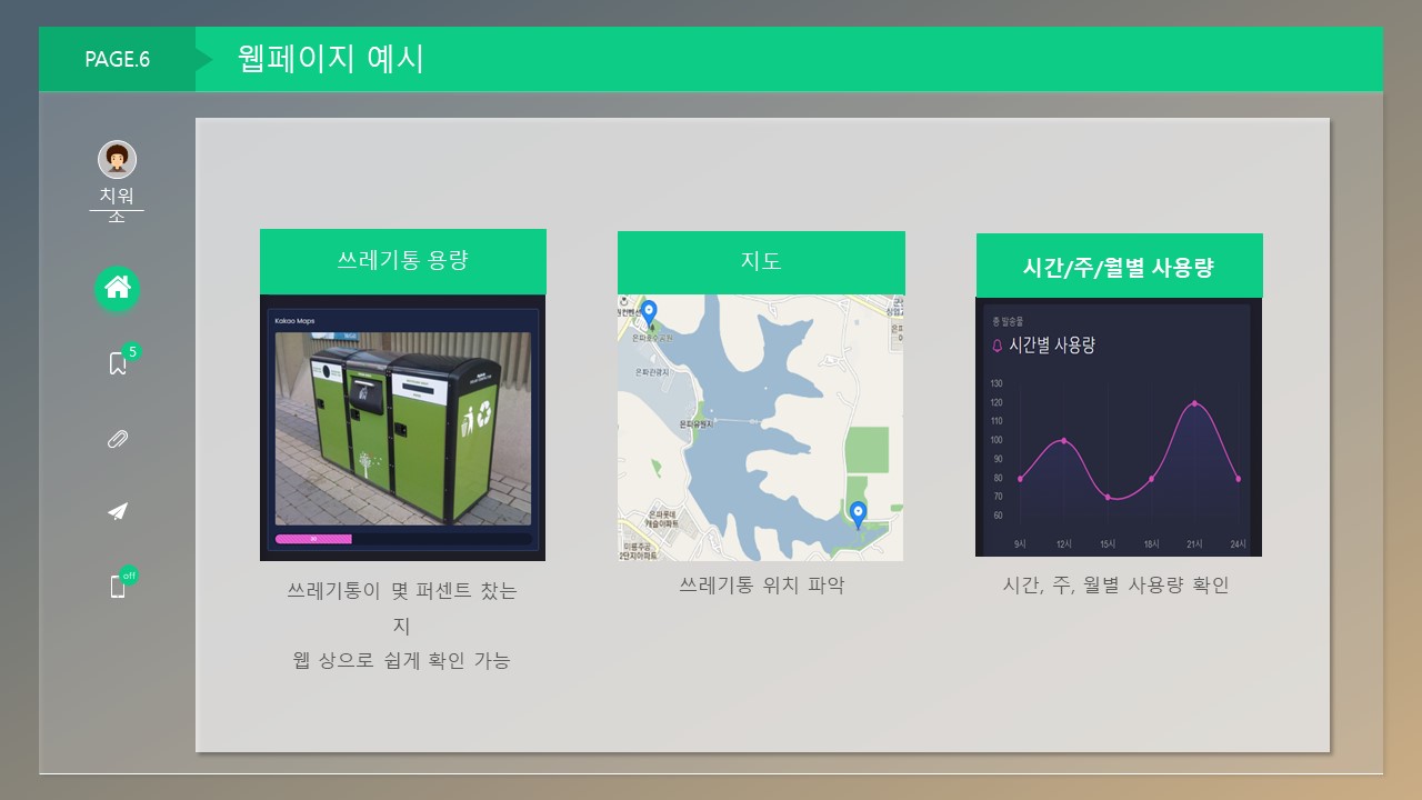 번거롭고 비효율적인 작업이라 생각하여 쓰레기통의 잔량을 실시간으로 알려주는 서비스를 만들고자 하였습니다.