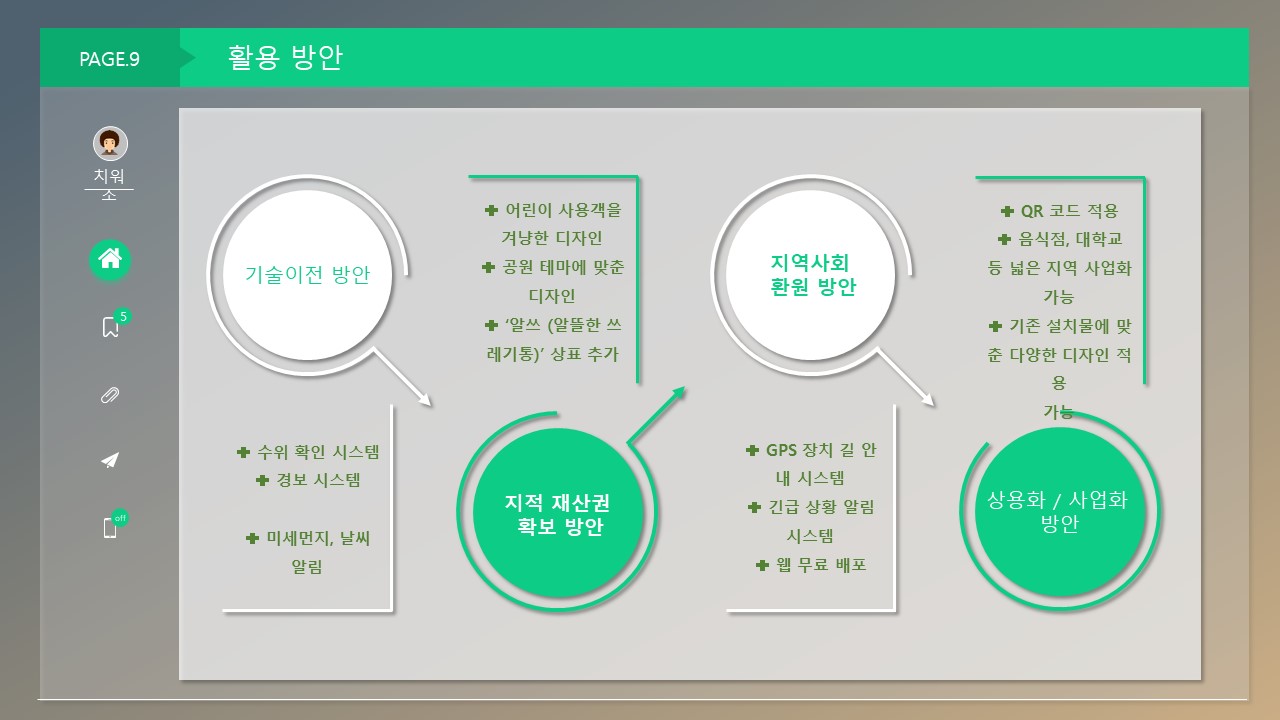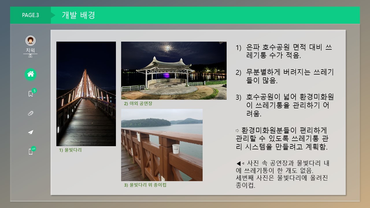 주제는 공원에서 불편한점을 IOT기술을 활용하여 해결하는 것이였습니다.