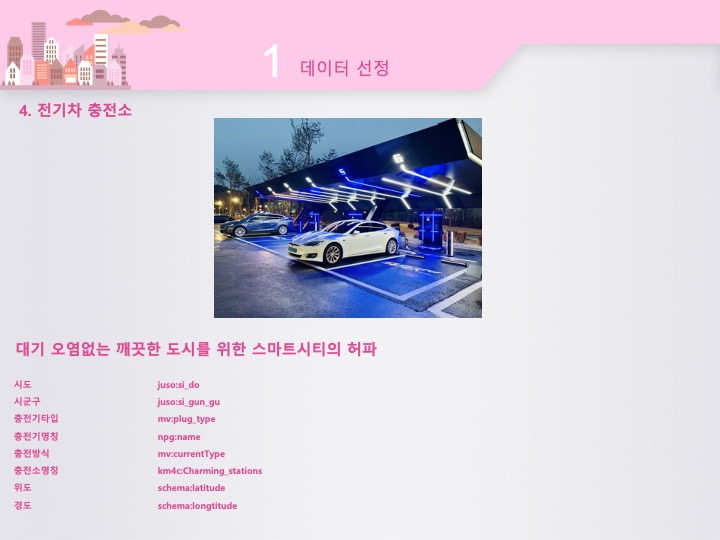 다음은 전기차 충전소를 선정하였습니다. 요즘 테슬라를 비롯하여 많은 전기차들이 인기를 받고있는데, 화석연료 대신 전기로 움직이는 전기차가 미래의 교통수단이 될 가능성이 높고 따라서 스마트시에서 전기차 충전소는 필수요소가 되었습니다.
