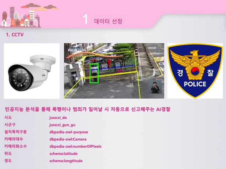 일단 첫 번째로 CCTV 데이터를 사용하였습니다. 스마트시티에서 CCTV로 영상분석을 하여 폭행장면 등을 실시간으로 AI 분석이 가능하기 때문에 CCTV를 중요한 요소 중 하나로 취급하였습니다.