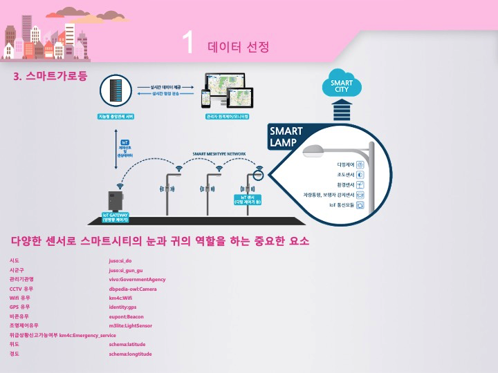 세번째로 스마트가로등을 선정하였습니다. 지금도 실제로 스마트가로등에 많은 센서들을 부착하여서 다양한 데이터들을 수집하는 역할을 하고 있습니다. CCTV, WIFI, GPS, 비콘, 조명제어센서, 위급상황신고 등의 기능들이 탑재되어서 서비스를 하고 있어서 스마트시티가 다양한 서비스를 하는 것을 도와줍니다.